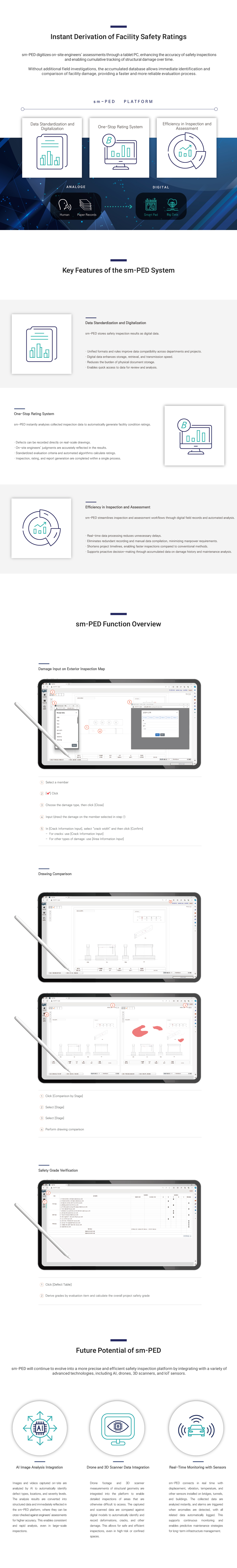It is a smart safety diagnosis software technology that digitally performs safety checks and status evaluations of facilities using tablet PCs. Improve the inefficiency of traditional inspection procedures and result dml reliability issues and organize maintenance management by building a database of damage histories. It can be applied to various facilities such as bridges, tunnels, ports, and buildings, and has on-site records based on full-size drawings, automatic rating calculation, and operating system compatibility. Automate on-site records and present new standards for facility management through integrated management functions.