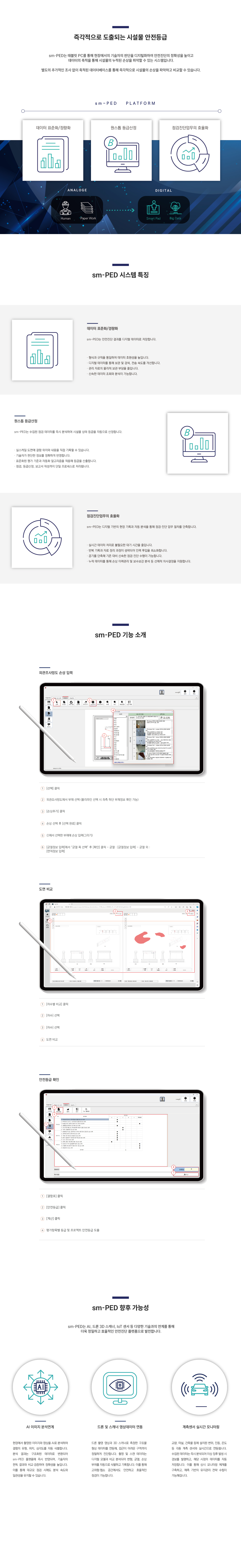 태블릿 PC를 활용해 시설물의 안전점검과 상태평가를 디지털 방식으로 수행하는 스마트 안전진단 소프트웨어 기술입니다.